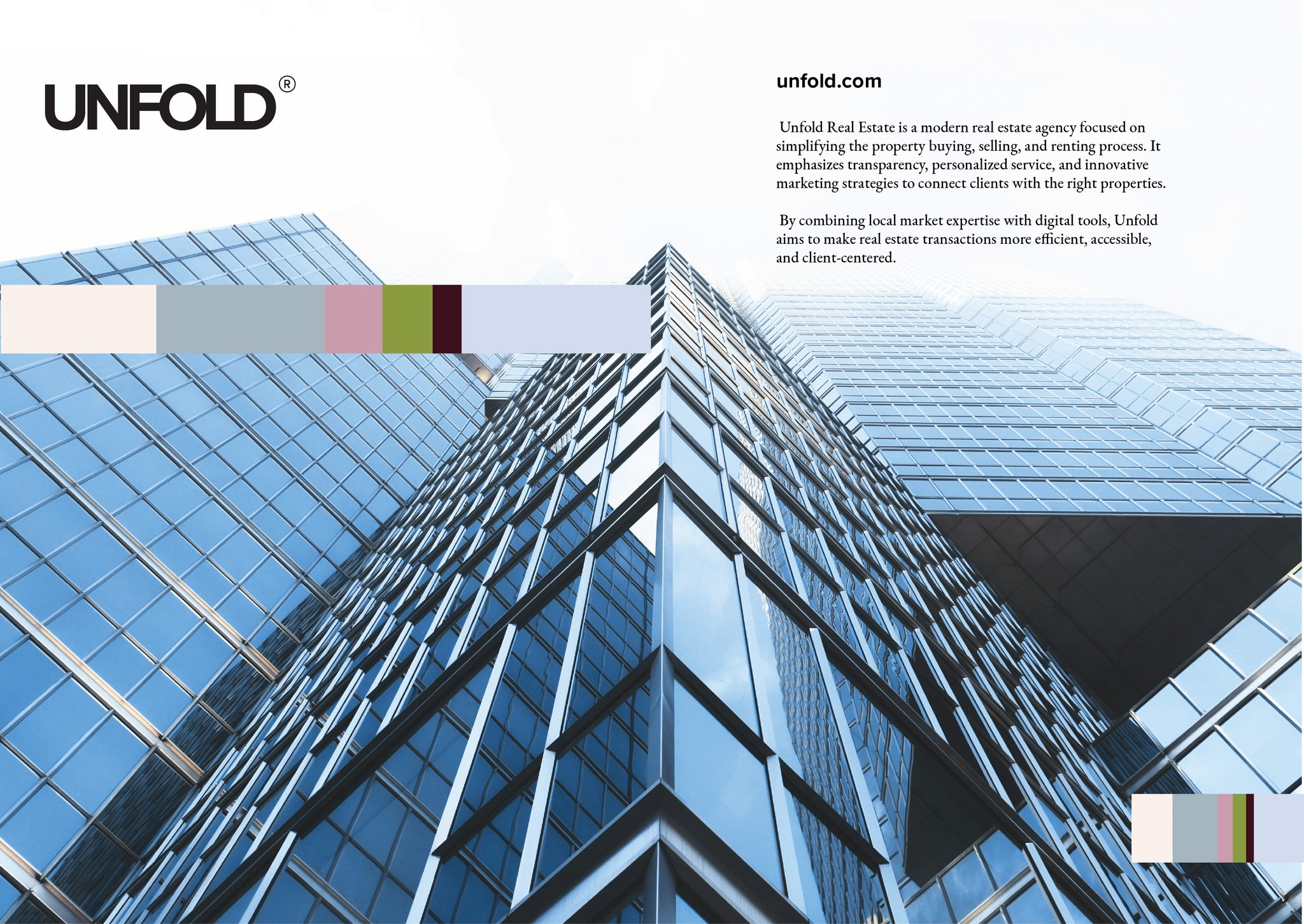 Unfold Real Estate is a modern agency dedicated to simplifying the process of buying, selling, and renting property. It prioritizes transparency, personalized service, and innovative marketing strategies to connect clients with the right opportunities. By combining deep local market expertise with advanced digital tools, Unfold Real Estate delivers a more efficient, accessible, and client-focused real estate experience. The identity of Unfold was designed to reflect a brand that is young and connected. The choice of colours, typography, and tone of voice communicates freedom and clarity with practical, contemporary aesthetic. We developed a contemporary and versatile identity, capable of communicating precision and modernity.